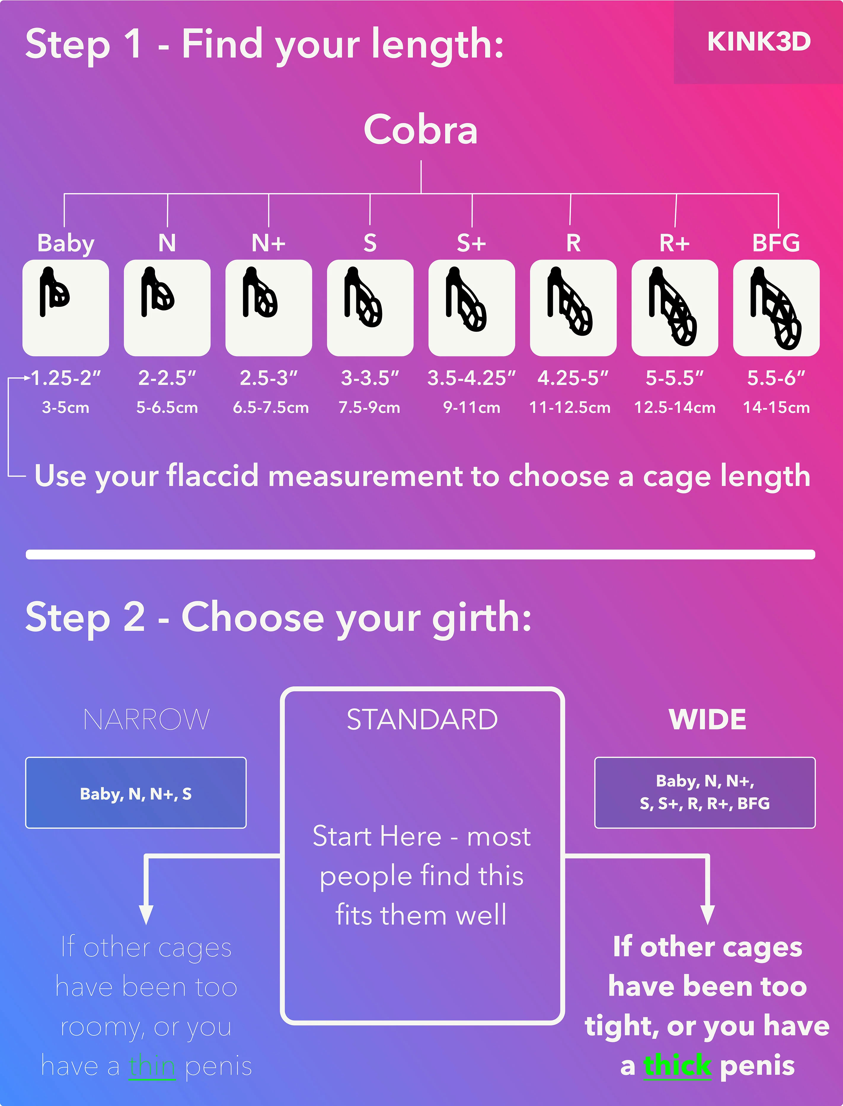 Length Advice. In our experience, customers are happiest when their Cobra cage is a good match for their flaccid length. If the cage is too short, it can hang off the body and only partially cover the shaft. If the cage is too long, the head of the penis may not sit in the head section of the cage.