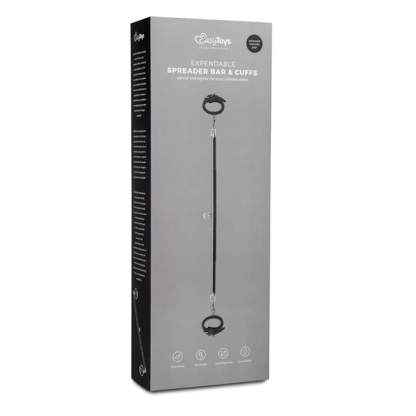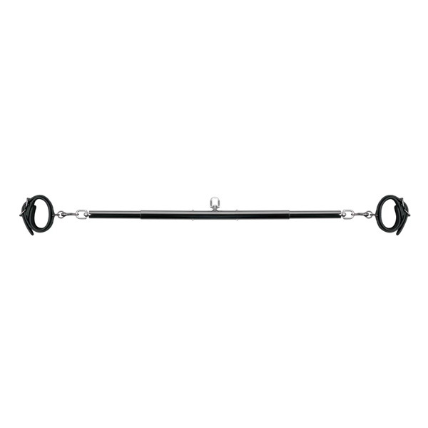 Spread the legs Adjustable cuffs With clip fasteners Strong material Suitable for other toys Colour: Black Limit your sub's movements with this strong metal spreader bar with handcuffs. The bar can be mounted on your ceiling using the D-ring on top of the bar. The bar itself can be adjusted in length from 70 cm to 90 cm. The cuffs can also easily be adjusted for a perfect fit. The cuffs are attached to the bar with clip fasteners, so you can detach them and use the cuffs separately. You can also use the ring on both ends to attach other bondage toys, such as ankle cuffs, to the spreader bar.