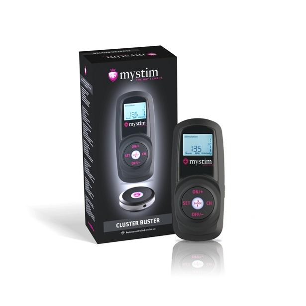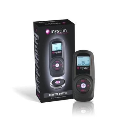 What is the Cluster Buster? The Cluster Buster is a Digital EMS device including remote control and receiver. It makes all your Mystim remote controllable – endless number of toys at a time. What are its functions? 12 stimulation and five training programs give you lots of variety. Push the "Shock Button“ and activate the maximum intensity. It features a large, illuminated display and intuitive control for games in the dark Technical Details: Type: EMS device Asymmetrical bi-phased square pulse Impulse width saved in every program Frequency range 2 - 70 Hz Intensity 0 - 70 mA Channels 8 Lithium-ion batteries Connection via the Mystim plug and the 2mm socket 12 months warranty the device can be preset and the switches can be locked extra large display for a perfect readability in every situation Simultaneous control of an unlimited number of toys