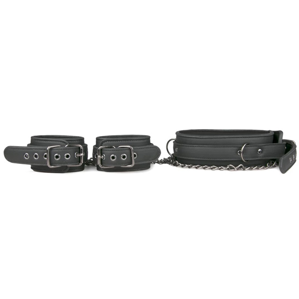 Durable Sturdy faux leather Lined with foam Adjustable With clip fasteners Colour: Black You are in control when your sub is wearing this fantastic bondage set! It consists of a collar with hand cuffs that can easily be detached from each other using the clip fasteners. The toys are made of sturdy faux leather lined with foam, which makes them durable and comfortable to wear. The collar is adjustable from 45 to 58cm and the cuffs are adjustable from 11 to 28cm. The chain has a length of 40cm. Combine this special set with other toys, such as ankle cuffs, ball gags, paddles and nipple clamps for an extra exciting experience.